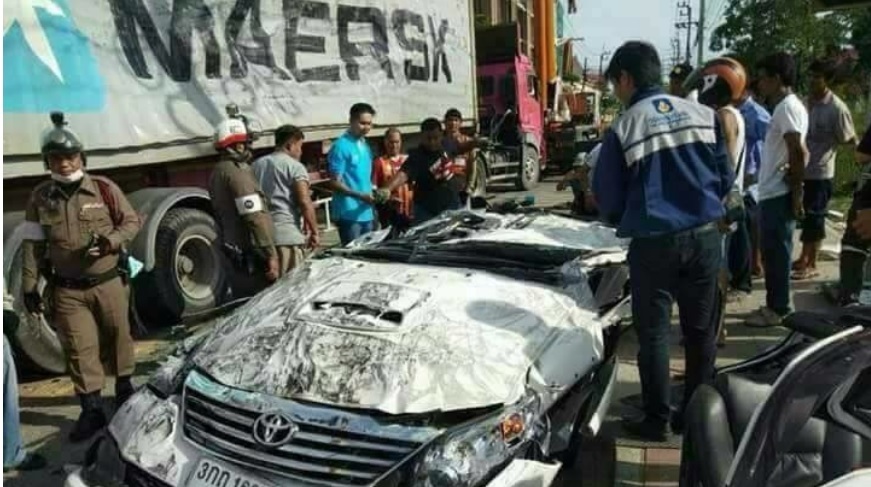 Trên đường rẽ trái, chiếc xe tải chở 46 tấn đậu nành đã mất kiểm soát và đổ đè vào chiếc Toyota Fortuner mà Worawut đang lái.