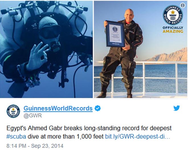 Với khoảng 17 năm kinh nghiệm lặn biển, Ahmed Gabr vẫn cần sự hỗ trợ của một đội ngũ lên tới gần 30 người để thiết lập kỷ lục. Anh mất 12 phút để đạt đến độ sâu đó và phần còn lại của ngày để trở lên và hồi phục.