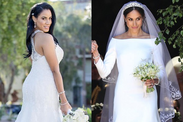 Trong khi Meghan mặc chiếc váy Givenchy trị giá hàng tỉ đồng để tiến vào lễ đường. Còn cô y tá Danielle diện chiếc váy ren cổ cao có giá chỉ hơn 30 triệu đồng. Nhưng trông họ vẫn thanh lịch như nhau.