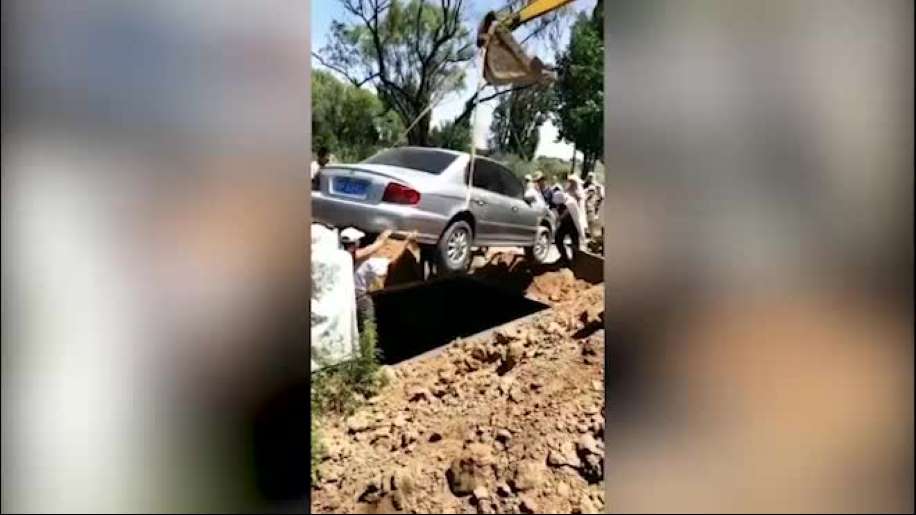 Trong đoạn video đăng tải trên mạng xã hội Weibo ngày 28.5, chiếc ô tô màu bạc chứa thi thể của ông Qi đã được cần cẩu từ từ hạ xuống huyệt có kích cỡ lớn hơn bình thường.