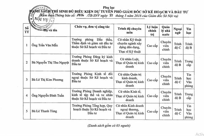 Đáng chú ý trong danh sách này là trường hợp ông Trần Văn Mẫn. Ông Mẫn hiện đang là Trưởng phòng Đấu thầu, Thẩm định và giám sát đầu tư thuộc Sở KH&ĐT. Ông này có bằng cử nhân kỷ thuật chuyên ngành xây dựng, Thạc sỹ kỹ thuật, bằng cao cấp lý luận chính trị, chuyên viên chính, ngoại ngữ trình độ C, tin học trình độ B.