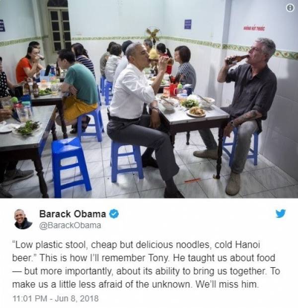 Hôm qua 8/6, đầu bếp Anthony Bourdain (người đã cùng ông Obama ăn bún chả tại Hà Nội) qua đời tại Pháp. Nguyên nhân ban đầu được xác định là ông đã tự vẫn trong một khách sạn. Khi nghe tin này cựu Tổng thống Mỹ Barack Obama đã vô cùng đau buồn.