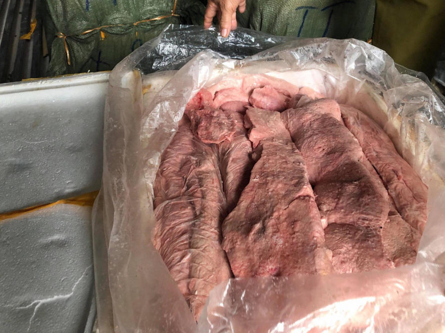 Qua kiểm tra phát hiện trên xe đang chuyên chở khoảng 100 bao hàng, mỗi bao nặng từ 60 - 80kg, bên trong mỗi bao hàng là một thùng xốp chứa các khổ thịt đông lạnh lớn xếp chồng lên nhau. Đặc biệt, các khổ thịt thịt heo và bò xung quanh tiếp giáp thùng xốp đang có dấu hiệu phân hủy và bốc mùi hôi thôi. Ngoài ra, trên mỗi thùng xốp có các dòng chữ Trung Quốc.