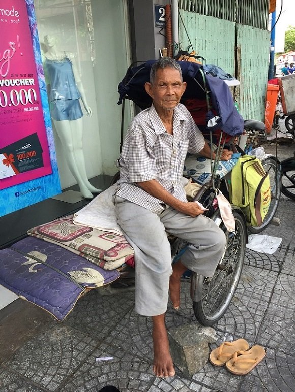 Ông ngủ ngoài đường suốt đêm. Ông không nhà cửa, vợ con. Chỉ một mình, ông có mặt tại đây hàng chục năm nay và trở thành người quen của khu vực này. Không còn chạy xe, hàng ngày ông vẫn được bà con thương tình người cho cái bánh, cái kẹo, người cho vài chục. Có lần có người cho ông 5 gói mì. Lúc ngồi buồn ông lấy ra ăn sống chứ làm gì có bếp núc mà nấu. Nhìn ông nhai, hàm răng trệu trạo thấy rất tội nghiệp...