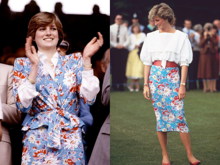 Đây là phần chân váy của set váy hoa matchy-matchy mà Công nương diện khi đi xem Wimbledon vào năm 1981 đã được bà diện riêng, phối cùng áo tay bồng vào vài năm sau đó, khi bà xuất hiện tại một trận polo tại Cirencester.