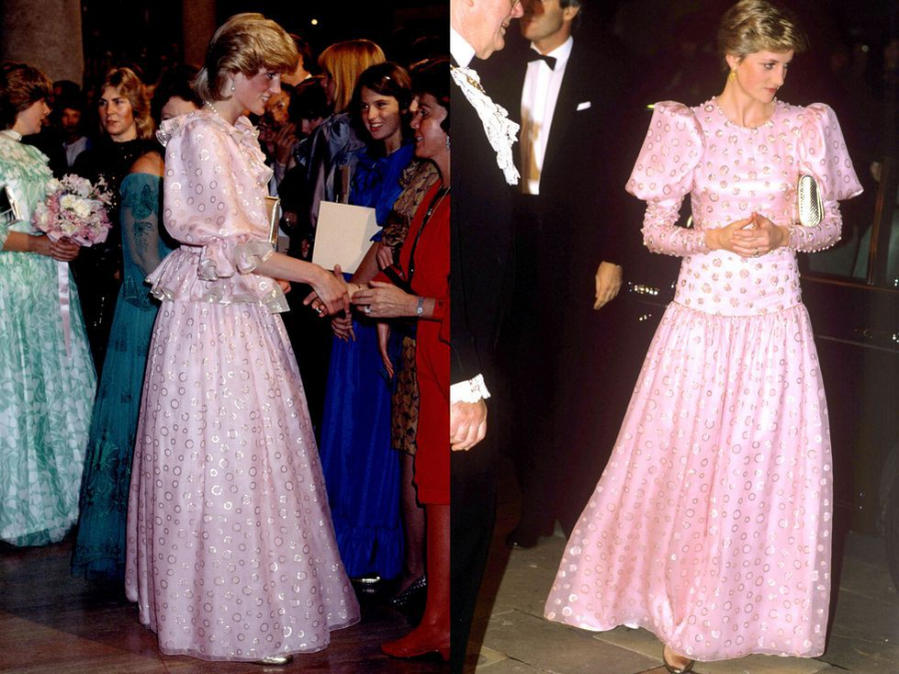 Với Công nương Diana, đầm dạ hội thường không chỉ được diện một lần duy nhất mà thay vào đó, bà uôn nghĩ ra cách để có thể mặc lại chúng mà không bị mang tiếng là mặc đồ cũ. Chiếc đầm màu hồng bà từng diện vào năm 1983 (ảnh trái) đã được may thêm tay dài, bỏ chi tiết peplum, đổi sang kiểu dáng đầm hạ eo vào năm 1986