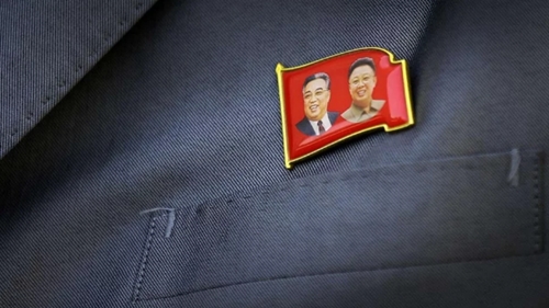 Huy hiệu cài áo có hình Kim Nhật Thành và Kim Jong-il. Ảnh: AP.