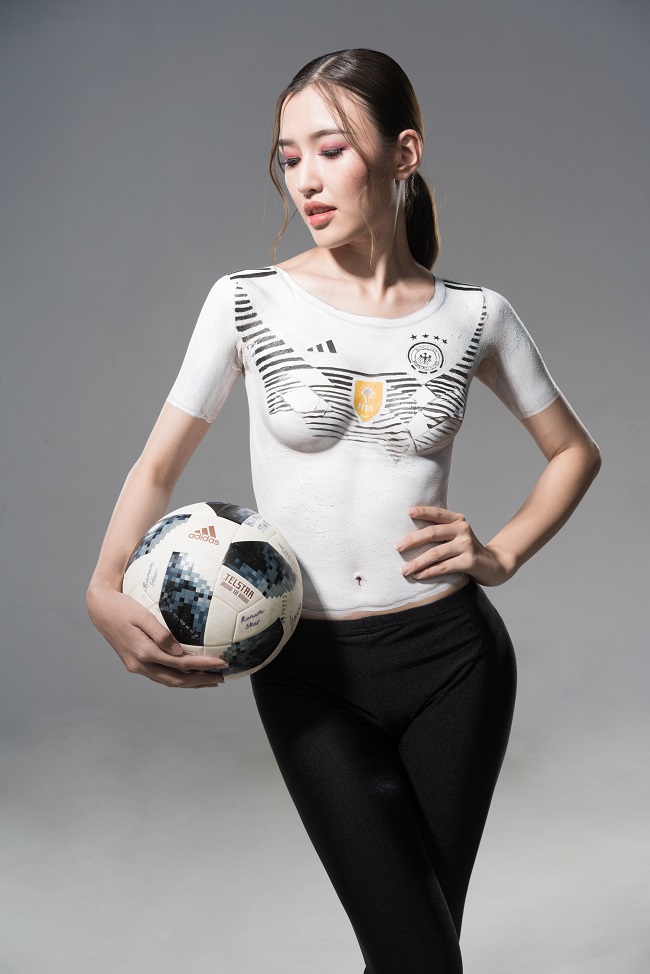 Cô nàng chụp 2 bộ hình cổ vũ cho Đức gồm bán nude và mặc áo sơn vẽ như thế này.