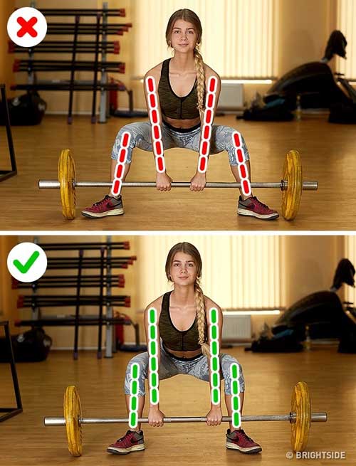 Chân và cánh tay đặt sai khi nâng tạ deadlift có thể khiến bạn bị ngã. Trước khi nâng tạ, hãy điều chỉnh chân và cánh tay thẳng, vuông góc với mặt sàn, mặt hướng về phía trước.