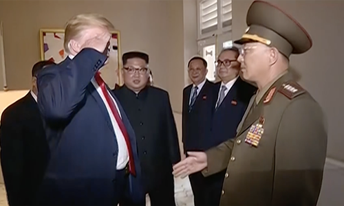 Ban đầu, ông Trump đưa tay ra bắt khi gặp tướng Triều Tiên No Kwang-chol. Tuy nhiên, vị tướng thay vào đó lại chào kiểu quân đội. Trong khoảnh khắc bất ngờ, Trump cũng đưa tay lên chào kiểu nhà binh. Hành động này lập tức gây tranh cãi.