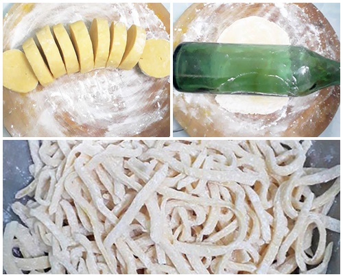 - Lấy dao cắt khối bột thành từng lát mỏng như hình. Cho chút bột khô vào thớt, lăn đều lát bột vào bột khô. Dùng cây cán bột hoặc chai thủy tinh cán mỏng ra.