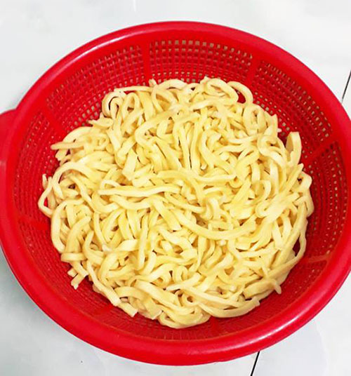 - Nấu nước sôi luộc bánh canh qua cho chín rồi xả nước lạnh. Tiếp tục nấu nồi nước sôi khác trụng lại rồi đổ ra để ráo. Khâu này giúp sợi bánh canh được dai, nếu để tủ lạnh 1 tuần cũng không hỏng.