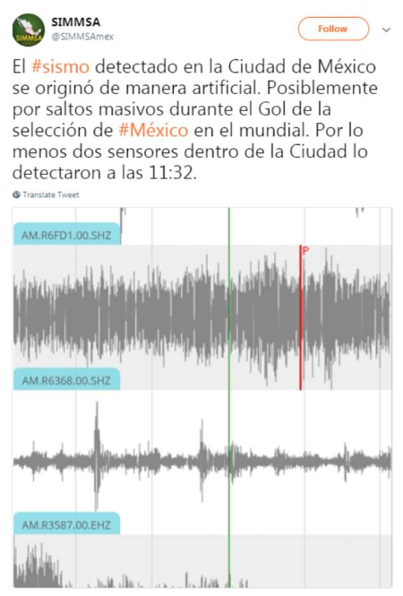 Viện nghiên cứu địa chất và khí quyển Mexico viết trên mạng xã hội: “Một cơn động đất nhân tạo đã diễn ra tại Mexico City. Dường như là do hàng triệu người cùng nhảy lên vì ăn mừng bàn thắng tại World Cup. Đã có tới hai cảm biến được nhận diện”.
