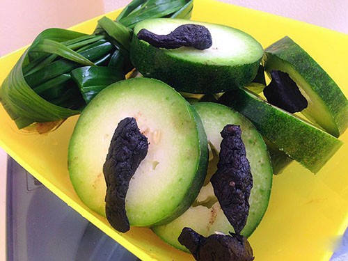 - Bí đao rửa sạch, cắt thành các miếng nhỏ. Lá dứa rửa sạch, buộc gọn.