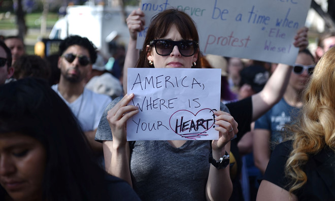 "Nước Mỹ, trái tim của bạn đâu rồi?", người biểu tình giơ biểu ngữ phản đối chính sách chia cắt gia đình của chính quyền Trump. Ảnh: Getty.
