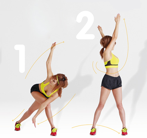 Đây là một động tác không hề xa lạ với phụ nữ, tuy đơn giản nhưng vẫn mang lại hiệu quả cao. Đứng thẳng lưng, hai chân dang rộng bằng vai, hai tay dang thẳng, gập người xuống, tay phải chạm chân trái, rồi tay trái chạm chân phải. Hãy duy trì 30 phút mỗi ngày với bài tập này sẽ giúp cho phần eo của bạn giảm lượng mỡ đáng kể.