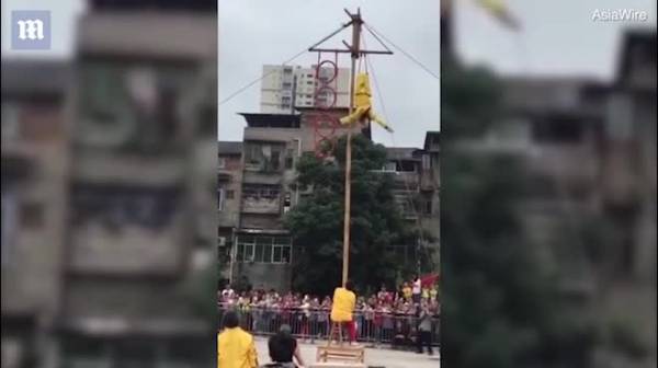 Đoạn video được ghi lại tại thành phố Trùng Khánh, Trung Quốc, cho thấy diễn viên xiếc hóa trang thành nhân vật Tôn Ngộ Không trình diễn màn nhào lộn trên cột tre cao hơn 10m, trước sự chứng kiến của rất đông khán giả.