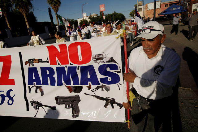Người dân ở TP Ciudad Juarez cầm biểu ngữ mang dòng chữ "Không vũ khí" trong cuộc tuần hành vì bình yên và chống bạo lực diễn ra ngày 23-6 sau các vụ nổ súng sát hại nhiều người - Ảnh: REUTERS