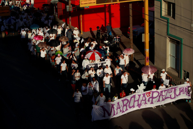 Người dân ở TP Ciudad Juarez cầm biểu ngữ mang dòng chữ "Tuần hành vì bình yên cho Juarez" trong cuộc tuần hành vì bình yên và chống bạo lực diễn ra ngày 23-6 sau các vụ nổ súng sát hại nhiều người - Ảnh: REUTERS
