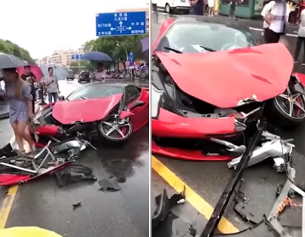 Hình ảnh các nhân chứng ghi lại được cho thấy mũi chiếc Ferrari 458 bị bẹp dúm. Trước đó vài phút, nữ tài xế chụp ảnh bên vô lăng trong khi đợi đèn đỏ để khoe với bạn bè trên mạng xã hội.