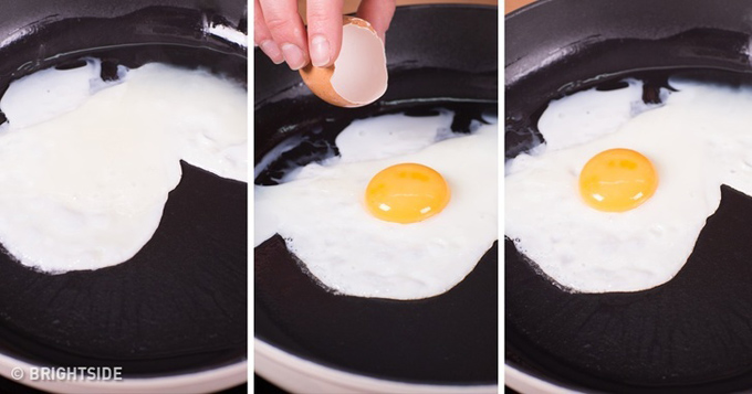 Khi làm trứng ốp la, người ta thường đập thẳng trứng vào chảo, bao gồm cả lòng trắng và đỏ. Nhưng thực tế, để trứng ốp trông đẹp hơn, bạn nên lọc lòng trắng và đỏ riêng, sau đó rán lòng trắng trong vòng một phút trước. Sau đó, đổ lòng đỏ lên trên. Với cách này, lòng trắng sẽ được chín kỹ, lòng đào giữ được nguyên vị ngon và đĩa trứng ốp la còn trông rất đẹp mắt với lòng đỏ ở chính giữa.