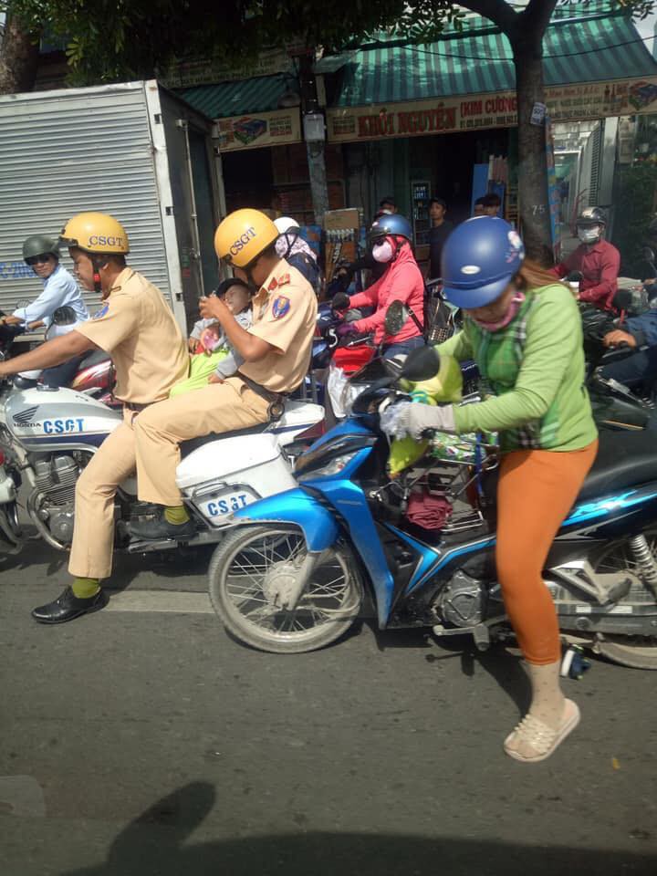 Chứng kiến sự việc, 2 đồng chí CSGT đã chạy lại giúp đỡ, sử dụng xe bồ câu chuyên dụng, cố gắng len lỏi giữa dòng xe cộ, thay người mẹ chở cháu bé đến bệnh viện kịp thời. Hình ảnh hai anh, một người cầm lái, một người ngồi sau bế cháu nhỏ dỗ dành, cho cháu bú bình thực sự gây chú ý, khiến nhiều người đi đường phải ngoái lại nhìn.