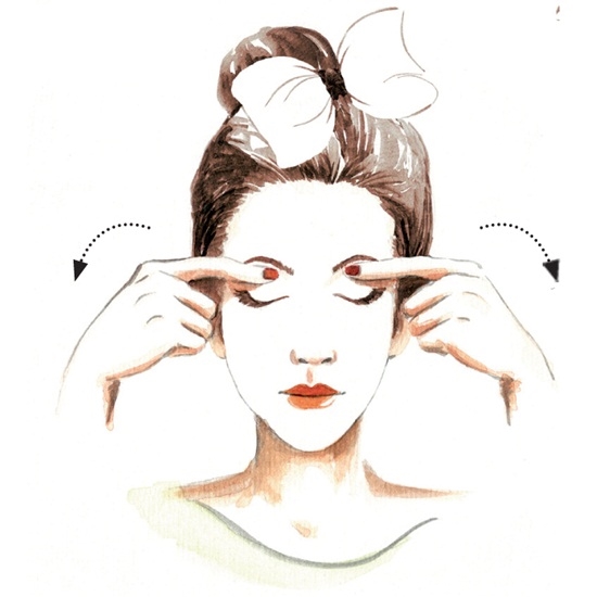 Đặt hai đầu ngón trỏ dưới chân mày, gần hai bên sống mũi. Dùng lực mạnh để ấn trong khi bạn kéo dần ngón tay về phía thái dương, men theo vòng cung của xương chân mày. Lặp lại động tác vài lần bạn sẽ thấy được sự khác biệt, mắt của bạn trông to và thu hút hơn mà không cần phải phẫu thuật bấm mí mắt.