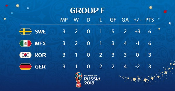 Như vậy Thụy Điển dẫn đầu bảng với 6 điểm. Thụy Điển và Mexico sẽ đi tiếp, Đức và Hàn rơi. Đức phải dồn lên tấn công.