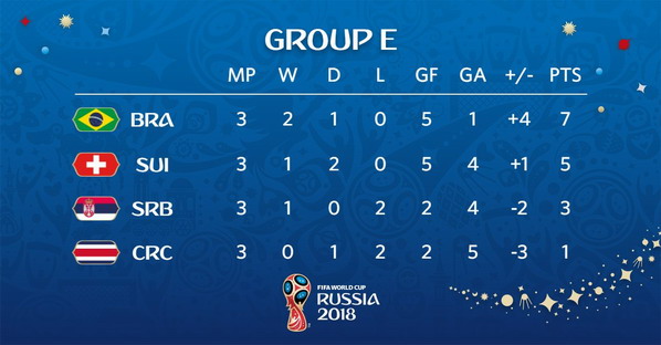 Chào cả nhà, trận đấu cuối của bảng E chung kết World Cup 2018. Serbia sẽ gặp Brazil và Thụy Sĩ sẽ gặp Costa Rica. Hiện tại Brazil đang có 4 điểm, Thụy Sĩ 4 điểm, Serbia 3 điểm và Costa Rica 0 điểm. Như vậy Costa Rica chắc chắn đã rơi. Serbia buộc phải thắng Brazil để vào vòng trong.