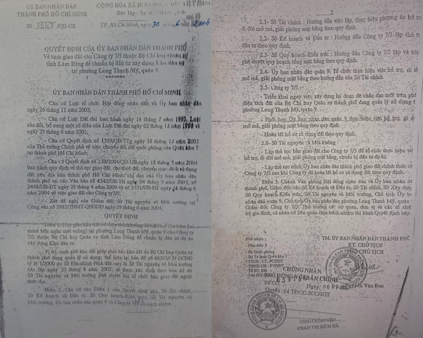 Theo hồ sơ, ngày 30.6.2004, Phó Chủ tịch UBND TP.HCM Nguyễn Văn Đua đã ký Quyết định 3243/QĐ-UB về “Tạm giao đất cho Công ty 7/5 thuộc Bộ Chỉ huy Quân sự tỉnh Lâm Đồng chuẩn bị đầu tư xây dựng Khu dân cư tại phường Long Thạnh Mỹ”. Từ văn bản này, UBND Quận 9 đã lập tức thu hồi, cưỡng chế nhằm lấy 324.000 m2 đất (của dân và đất công – đất công là một phần trường bắn), ngay cả khi Công ty 7/5 đã giải thể.