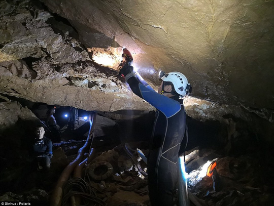 Thợ lặn bên trong hang Tham Luang. Ảnh: Reuters, Tân Hoa Xã
