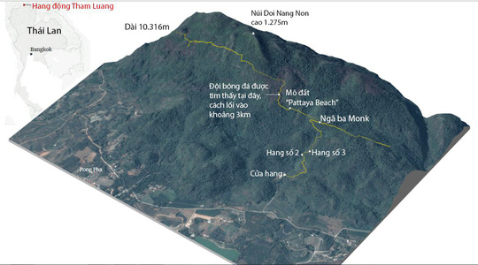 Đội bóng "Lợn hoang" đã vào rất sâu trong hang Tham Luang. Đồ họa: Guardian