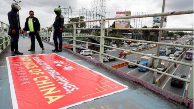 Tấm băng rôn màu đỏ có dòng chữ "Welcome to the Philippines, Province of China". Ảnh: Reuters