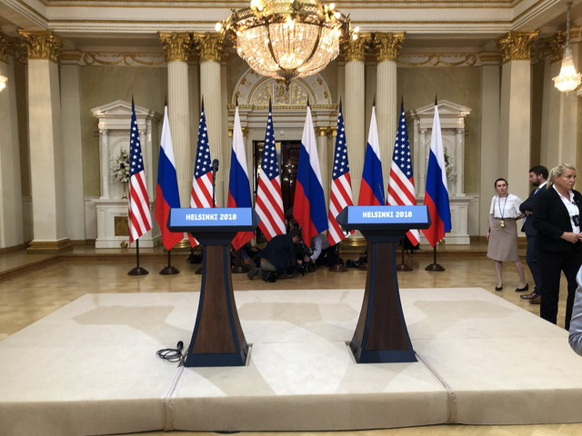 Hiện các phóng viên đã có mặt đông đủ tại căn phòng chuẩn bị diễn ra cuộc họp báo chung giữa Tổng thống Trump và Tổng thống Putin nhằm thông báo kết quả hội nghị.