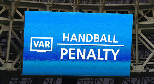 Thông báo phạt đền vì bóng chạm tay của công nghệ VAR. Ảnh: BPI.