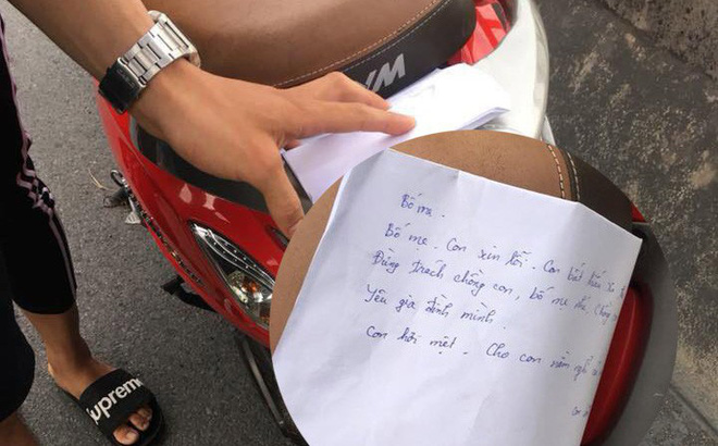Trên xe có để đôi dép, mũ bảo hiểm, khẩu trang và chìa khóa vẫn vào cắm ổ khóa. Trong cốp xe có giấy tờ tùy thân và lá thư.