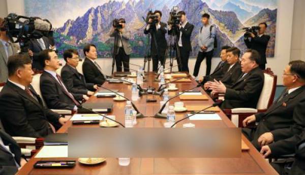 Phái đoàn Hàn Quốc (trái) và Triều Tiên (phải) tại cuộc hội đàm ở làng đình chiến Panmunjom ngày 1/6.