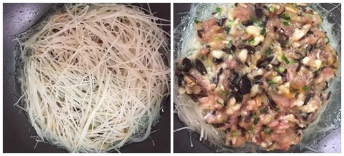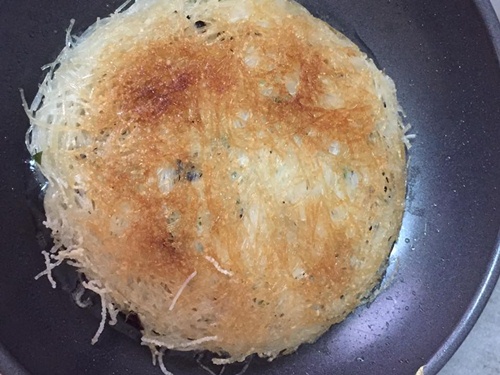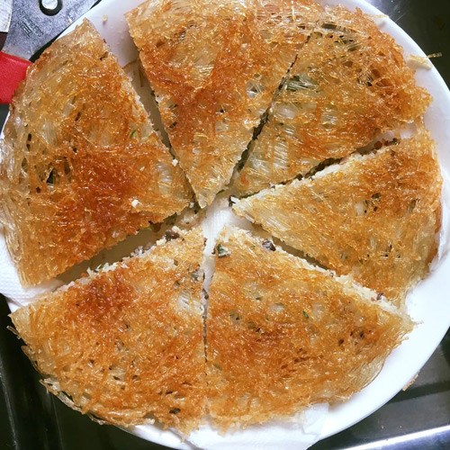 – Bắc chảo lên bếp và đổ dầu, khi dầu nóng, rải 1 lớp miến kín mặt chảo (chảo nhỏ, đường kinh 20cm). Tiếp theo cho 1 lớp nhân thịt dàn đều, khoảng 5 phút sau cho tiếp 1 lớp miến rải đều phủ kín mặt nhân, đun nhỏ lửa khoảng 10 phút, rồi dùng đũa lật. Đợi miến chín vàng 2 mặt thì gắp ra, để vào giấy thấm dầu.