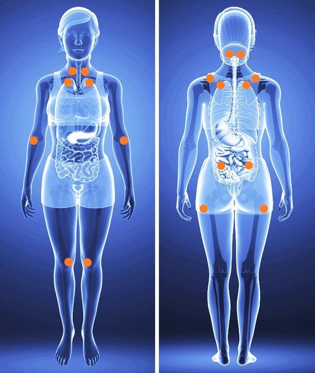 Biểu đồ các vị trí đau bạn có thể tự kiểm tra: Dấu hiệu chính của bệnh đau xơ cơ là đau mang tính đối xứng.