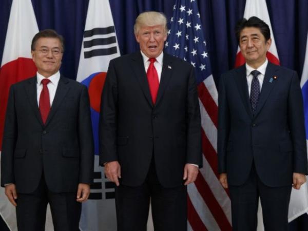 Tổng thống Donald Trump (giữa) và người đồng cấp Hàn Quốc Moon Jae-in (trái) đều đã gặp thượng đỉnh với nhà lãnh đạo Triều Tiên, trong khi đó Thủ tướng Nhật Bản cũng từng cân nhắc gặp gỡ ông Kim Jong Un. Ảnh: Breitbart