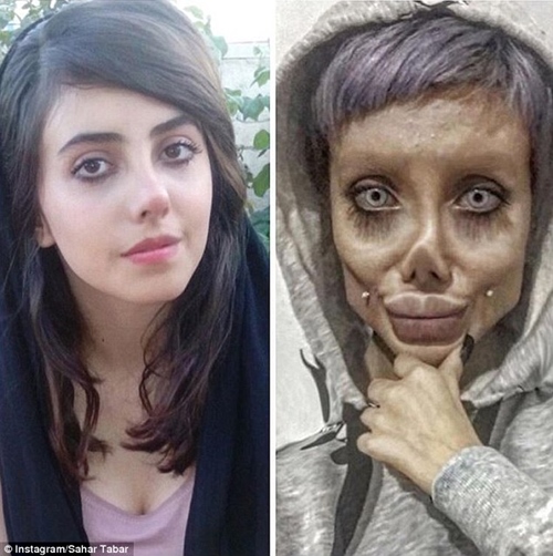 Cũng cặp mắt sâu và to, cũng đôi môi dày cộp, cũng gò má cao nhưng Sahar Tabar khiến người ta hoảng sợ bởi bộ dạng tong teo, hốc hác. Có thông tin cho rằng cô đã trải qua 50 cuộc phẫu thuật thẩm mỹ cũng như giảm cân điên cuồng để có được ngoại hình như nữ diễn viên từng đoạt Oscar song thật tiếc, mọi chuyện đã đi quá xa. Thay vì xinh đẹp và quyến rũ như Angelina Jolie, Sahar Tabar lại đem tới cảm giác rùng rợn như nhân vật chính trong phim “Cô dâu ma”.