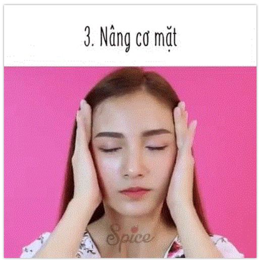 Dùng phần thịt đầy đặn nhất của lòng bàn tay (ngay chỗ ngón cái) ép vào 2 bên thái dương với động tác kéo lên trên. Đồng thời, miệng tròn lại như đang phát âm chữ “hô” và chu nhọn ra. Động tác kéo giãn cơ hàm giúp ngăn ngừa nếp nhăn khóe miệng khi cười và nếp nhăn dưới mắt, gò má.
