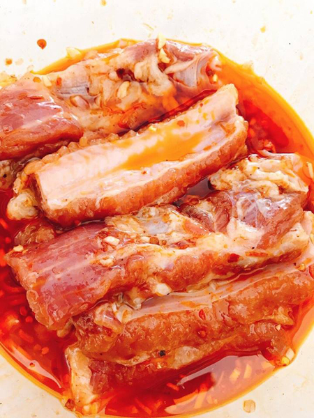 - Ướp sườn với 1 thìa canh đường, sa tế gần 1 thìa canh, 1 thìa nhỏ hạt nêm hoặc bột ngọt, 1/2 thìa canh dầu hào, ít nước tương, gần 1 thìa canh nước mắm, ít ớt khô, hành tỏi băm nhỏ trộn đều, cho thêm ít dầu ăn trộn đều lần nữa cho thấm. Ướp sườn 1-2 tiếng hoặc hơn.