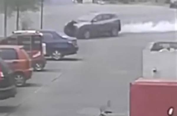 Theo đó, khi một người đàn ông đi ngang qua sân, chiếc xe hatchback màu bạc đang đi chậm bỗng nhiên tăng tốc. Bánh xe ma sát với mặt đường bốc khói trắng mù mịt. Tiếp đó, chiếc xe lao thẳng vào người đàn ông này, đẩy nạn nhân đi hàng chục mét đến khi đâm thẳng vào một gốc cây mới dừng lại được.