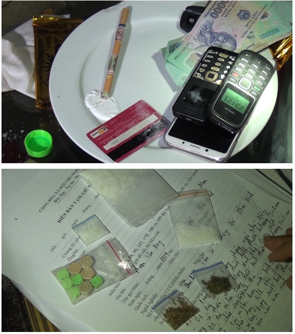 Khám xét hiện trường nơi các đối tượng “thác loạn” và nơi ở của Hưng, cảnh sát thu giữ 1 túi ni lông chứa tinh thể trong suốt, 1 túi ni lông chứa bột màu trắng và tinh thể trong suốt, 1 túi ni lông chứa chất thực vật màu trắng, 4 túi ni lông bên trong có chứa 54 viên nén dạng ma túy tổng hợp, 1 súng hơi, 5 triệu đồng cùng nhiều tang vật liên quan khác.