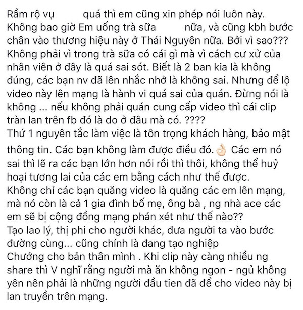 Vũ Đoàn (hiện sinh sống tại TP Thái Nguyên) mới đây đăng dòng trạng thái khá dài liên quan tới vụ việc, thu hút hơn 13.000 chia sẻ, 12.600 bình luận đồng tình. Cụ thể, Vũ Đoàn khẳng định "sẽ không bao giờ uống trà sữa tại đây nữa".