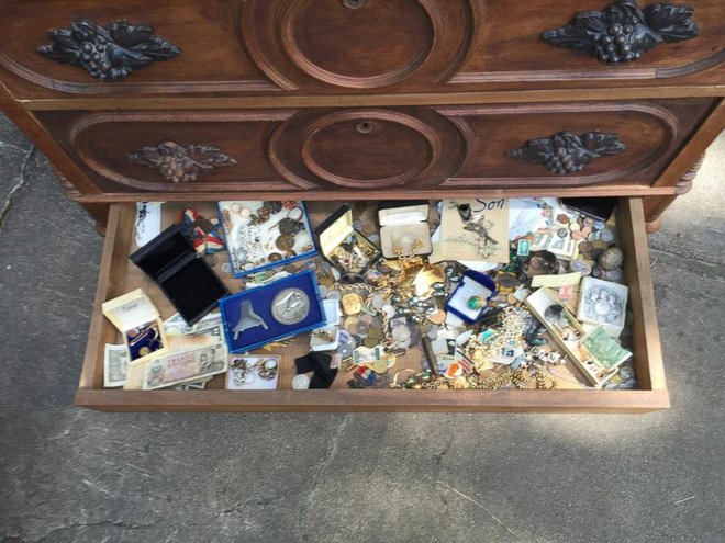 Khi mở ra, họ phát hiện chiếc tủ có một ngăn bí mật và nó chứa một kho báu thật sự. "Có nhẫn, kim cương, vàng và đủ thứ khác. Nó khiến tôi choáng váng. Cả hai chúng tôi đã sững sờ trong vài giây" - anh Allen cho biết.
