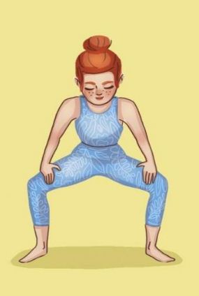 Bạn đứng thẳng trên sàn, hai chân mở rộng hơn vai. Sau đó khuỵa chân xuống, bàn chân hướng ra ngoài, chú ý giữ lưng thẳng. Lúc này hai tay chống lên hai bên đùi, phần bụng hơi gập, vai hạ thấp như thể bạn đang sắp ngồi lên ghế. Duy trì nhịp thở đều đặn và giữ nguyên vị trí trong 30 giây.