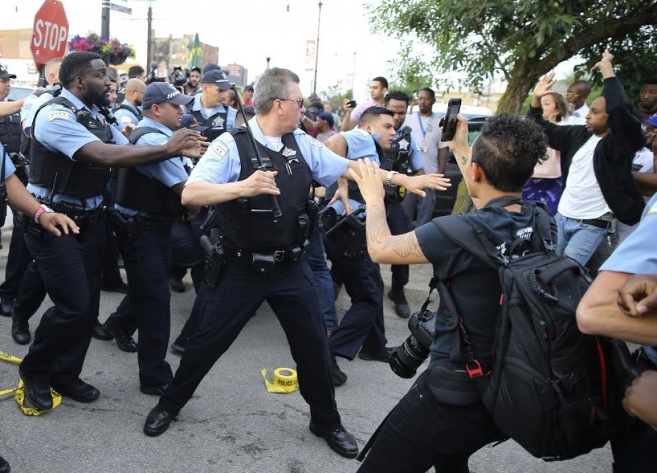 Cảnh sát Chicago và một đám đông giận dữ tại hiện trường của một vụ bắn súng hồi tháng 7. (Nguồn: AP)