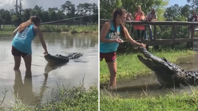 Nhiều người đã vô cùng hoảng sợ trước sự liều lĩnh của cô gái. Cô không ngần ngại xuống hồ nước sâu và gọi cá sấu lên bờ. Điều đáng nói, con cá sấu không hề tấn công, mà ngoan ngoãn nghe lời cô gái.